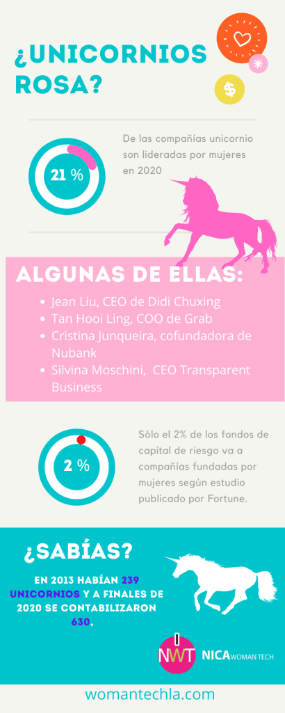 Lamentablemente, un gran porcentaje de esos unicornios tecnológicos sólo tienen fundadores o líderes masculinos, los unicornios rosa (como se refieren a los que son fundados por mujeres) son pocos, pero hay esperanza, pues en 2013 apenas 9% compañías eran lideradas o fundadas por mujeres y a finales de 2020 ya son 21%.