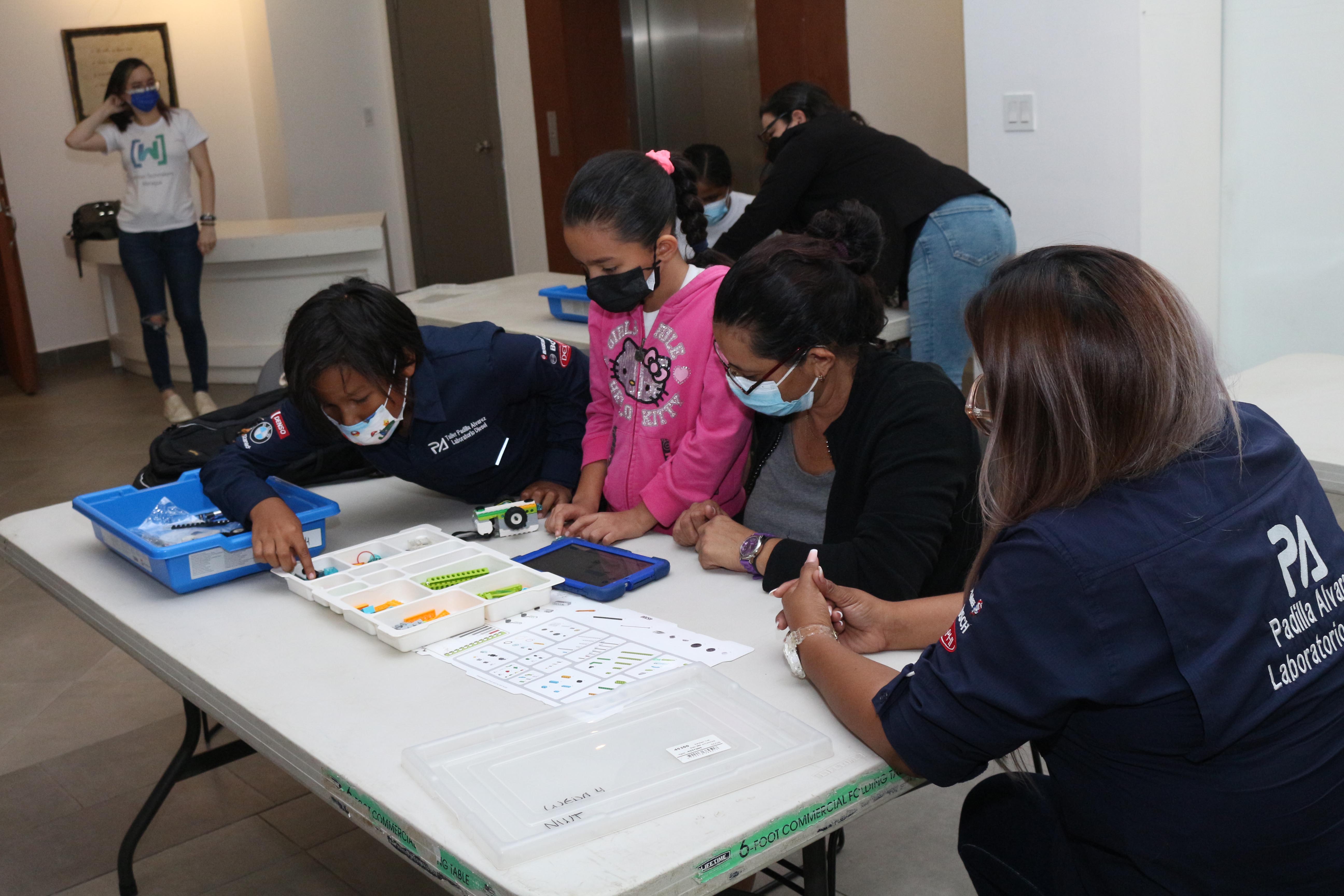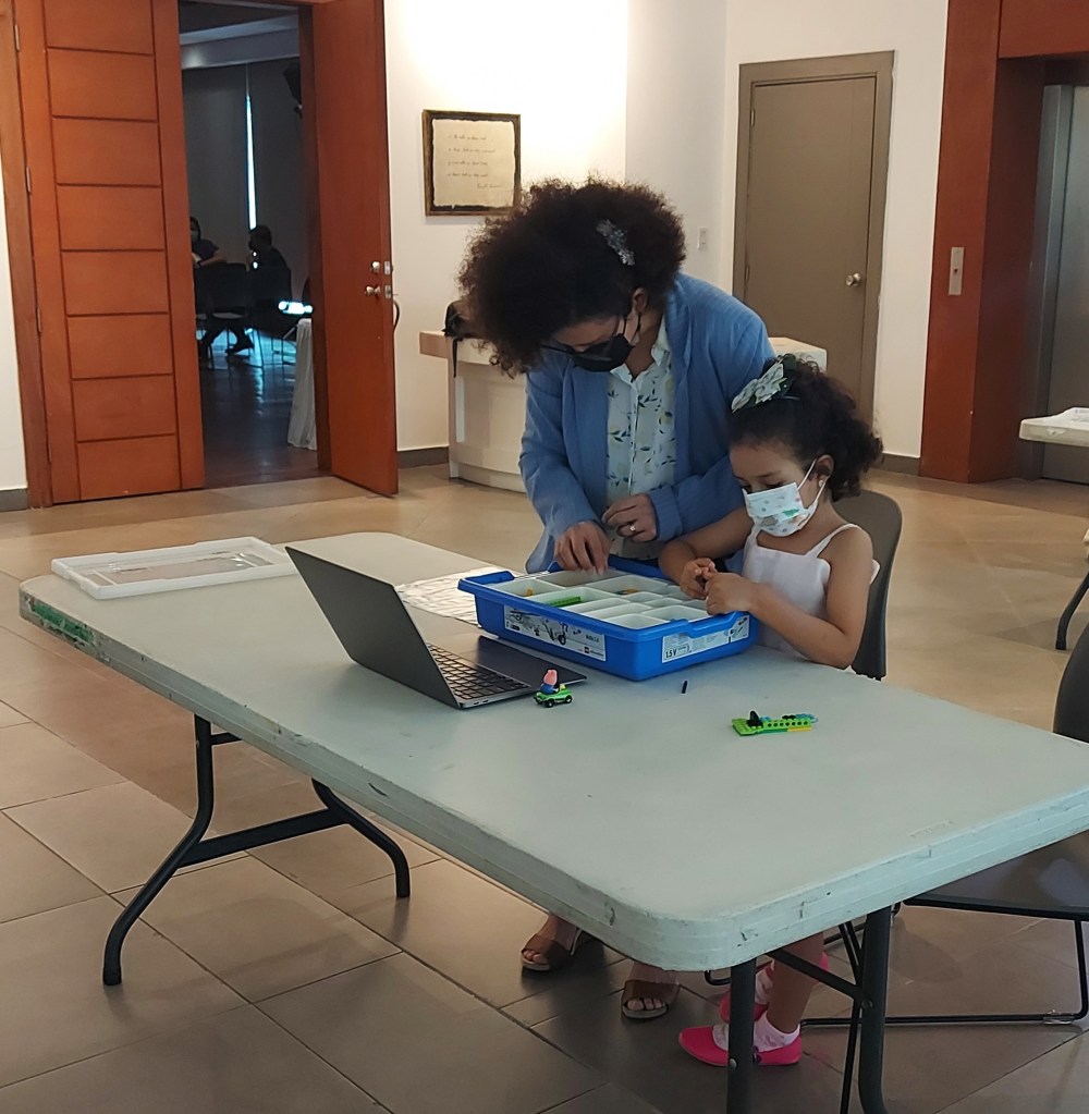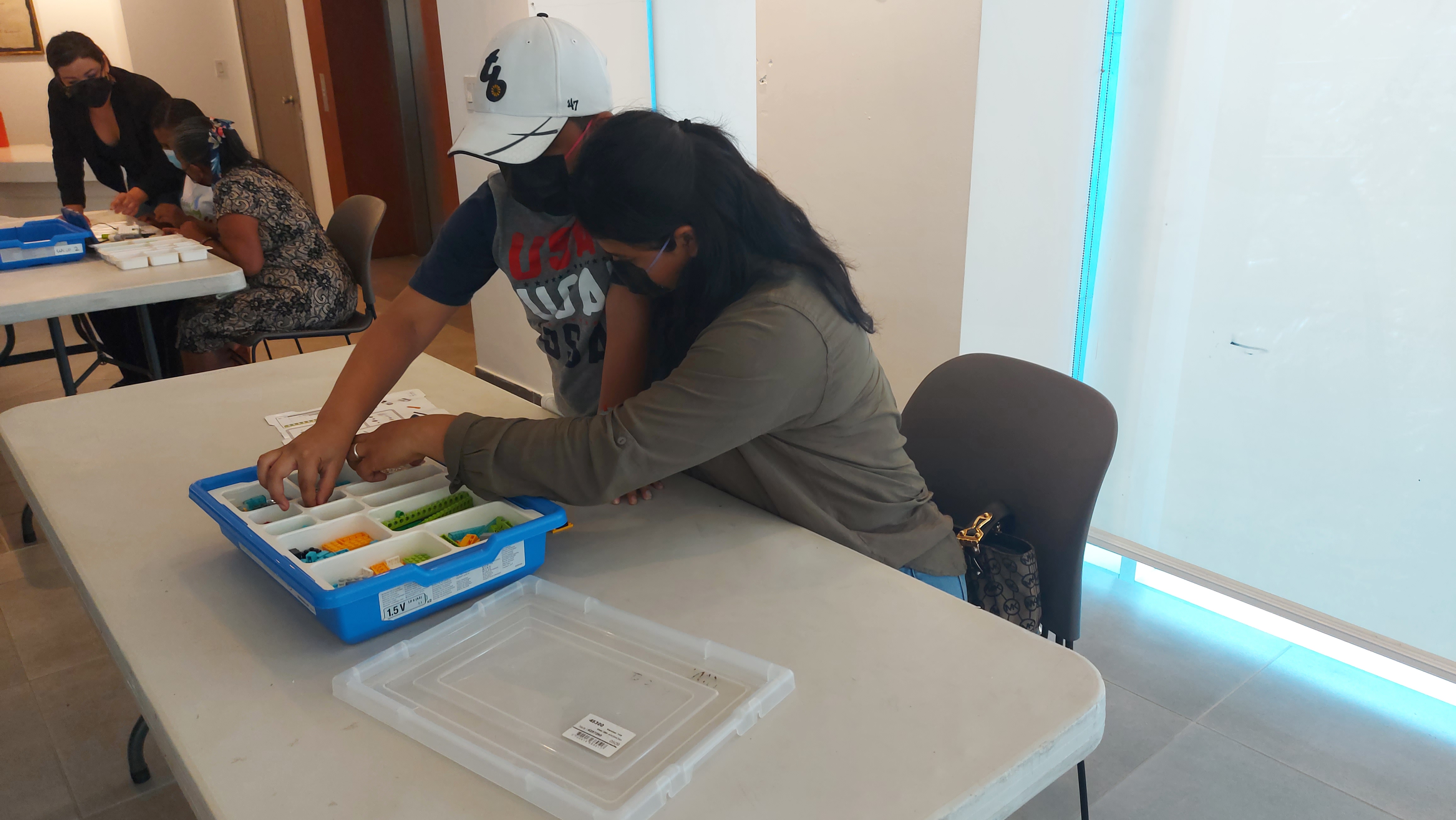 Las pequeñas manos de Hipatia seleccionan y colocan con mucha destreza las piezas del Lego para construir su robot, ella y su mamá siguen atentas las instrucciones para culminar con éxito el proyecto durante el taller tech realizado por NICAWomanTech como parte del evento MOM & TECH: Aliadas Increíbles en el Centro Pablo Antonio Cuadra de Hispamer.