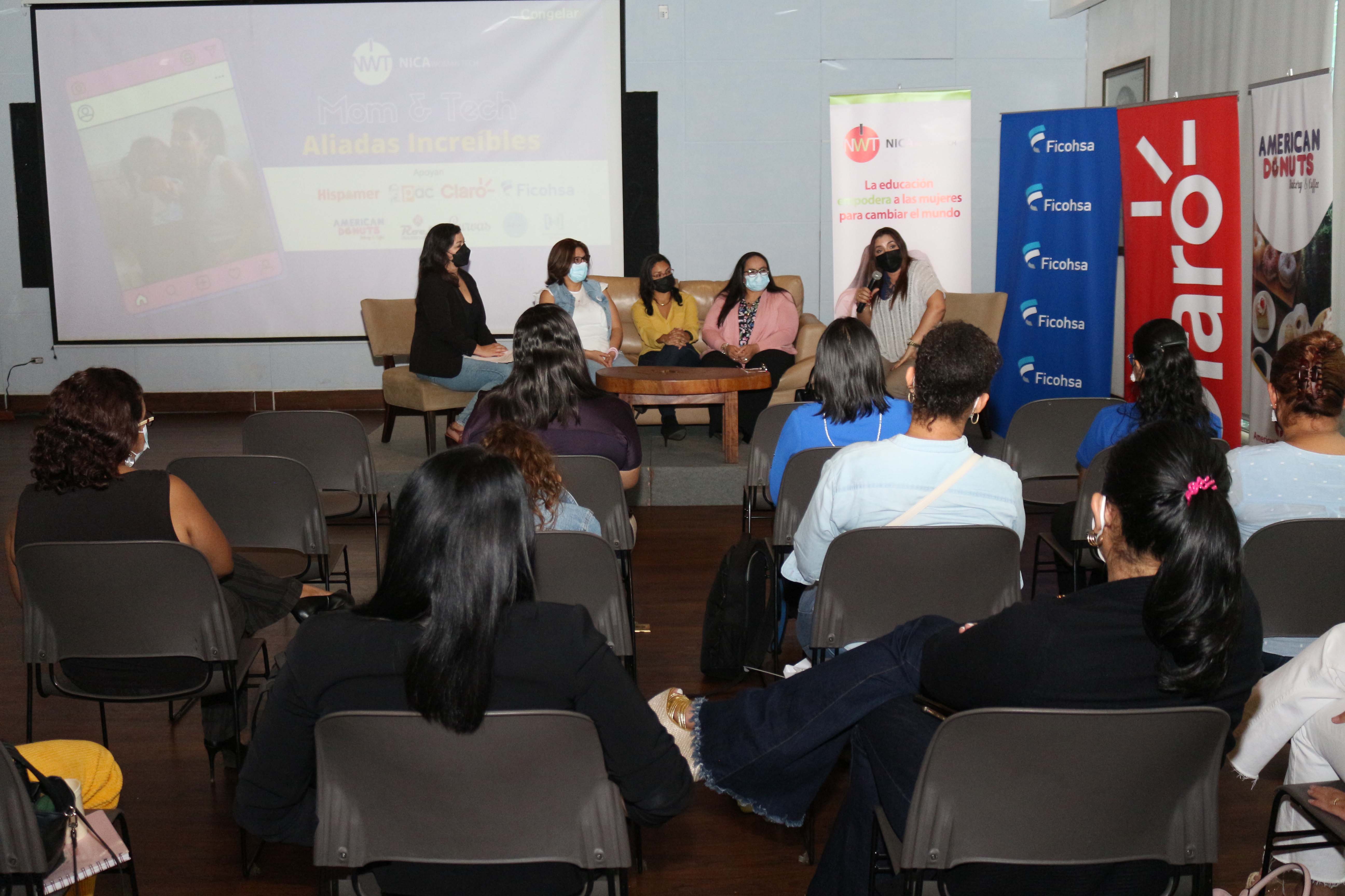 De izquierda a derecha: Lucia Morales De Franco, fundadora de NICAWomanTech; Ivonne Arauz, mamá tech; Ing. Darling Pérez, Project Manager Profesional; Katherine Salvatierra, Banco Ficohsa; Gilda Tinoco, Gte. Comunicación Corporativa de Claro Nicaragua.