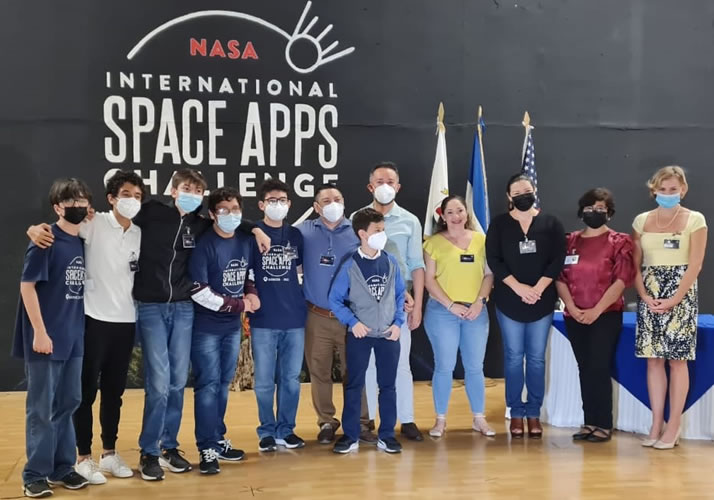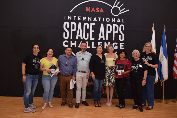 Jurado evaluador junto a equipo organizador del Nasa International Space Apps Challenge Managua. (Foto cortesรญa)