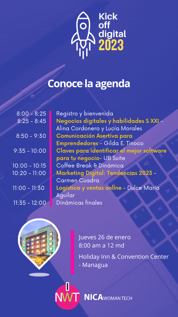 “Consciente de los retos que 2023 trae a nivel mundial y con el objetivo de impulsar a los negocios y emprendimientos nicas brindando elementos relevantes para diseñar una estrategia empresarial con ayuda de la tecnología hemos diseñado este Kick Off Digital en su primera edición” expresa Lucía Morales, Fundadora de NICAWOMANTECH.