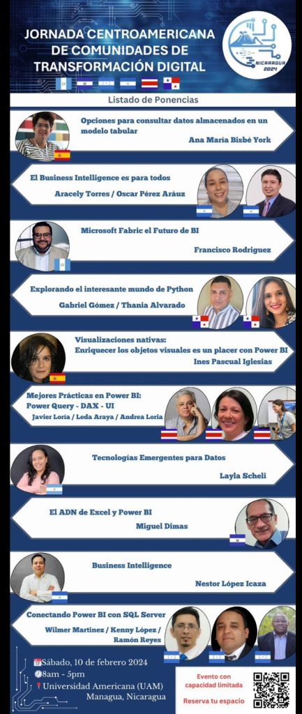 En mi caso, el equipo de Costa Rica tendremos la ponencia llamada “Mejores Prácticas en Power BI: Power Query – DAX – UI”. La haremos en conjunto Javier Loria, Andrea Loria y yo. Cada uno expondrá las mejores prácticas en el área donde se ha desarrollado mayor experticia. En mi caso, les estaré hablando de DAX, el lenguaje que usa Power BI para enriquecer el modelo de datos, pautas en su uso, consideraciones para facilitar su implementación, lo importante de trabajar en la legibilidad del código, tips sencillos al escribir código para un mejor rendimiento y otras prácticas que han sido el resultado de la experimentación y la implementación de proyectos de Power BI con el fin de que la comunidad se puede sentir más cercana a DAX y le pierdan el miedo. De la misma manera, Javier y Andrea también abordarán mejores prácticas en Power Query y Visualización de Informes basados en distintas áreas de proyectos realizados en áreas como Financiero-Contable, Manufactura, Inventarios, Exportación de Productos o Recursos Humanos, entre otros.