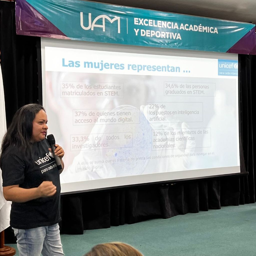 Como representación de UNICEF Nicaragua, Vanessa Pichardo, quien es especialista en protección y punto focal de género compartió una valiosa charla destacando la relevancia de la educación STEM en las niñas y compartiendo causas hacen que aún persistan desigualdades en estos campos. Brindó recomendaciones que pueden implementarse desde los diferentes espacios de interacción como el hogar, socialización con sus pares femeninos y la escuela.