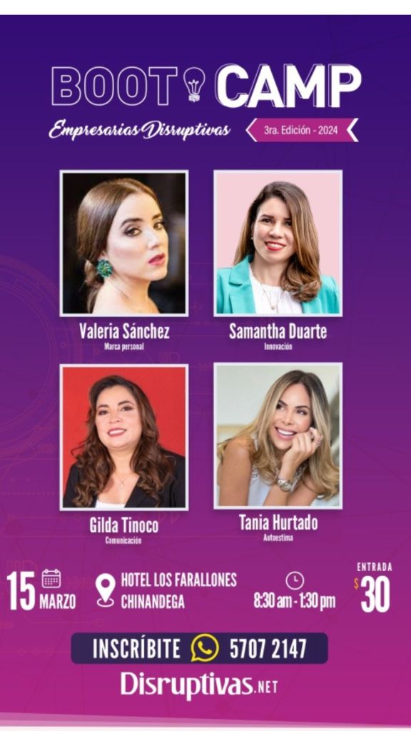 Estas temáticas serán impartidas por expertas en el tema: Valeria Sánchez, Tania Hurtado, Gilda Tinoco y Samantha Duarte. El bootcamp se realizará el viernes 15 de marzo en el hotel Los Farallones de Chinandega, la jornada inicia a las 8:30 a.m. con una inversión de $30 dólares.
