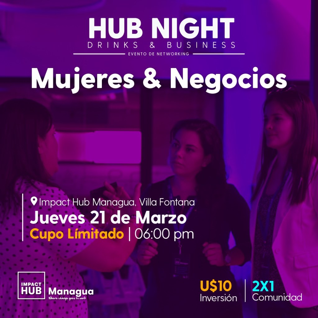 Mujeres & Negocios se realizará el próximo jueves 21 de marzo a las 6:00 p.m. en Impact Hub Managua ubicado del Zócalo Villa Fontana, 2 cuadras al sur, ½ al oeste. Inversión $10 dólares. Puedes registrarte en: https://bit.ly/HubNight_MGA
