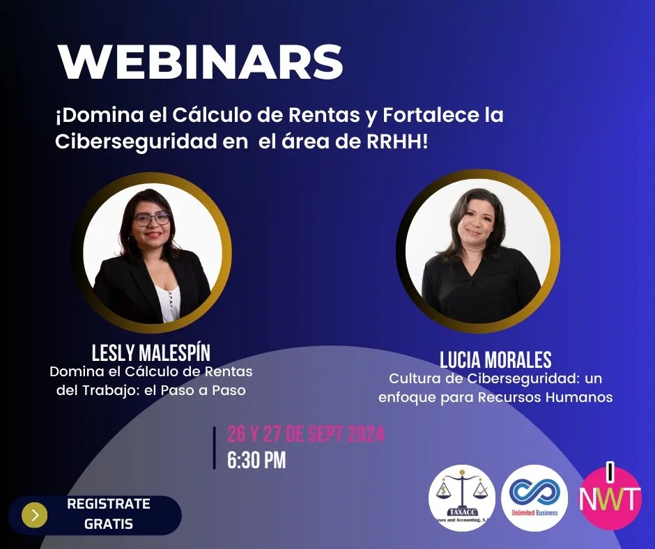 Como parte de las actividades previas a la conferencia, se han programado dos webinars diseñados para administradores, gerentes de RRHH, jefes de personal, gerente y directivos interesados en mejorar la cultura en seguridad digital y aprender el cálculo de rentas del trabajo paso a paso.