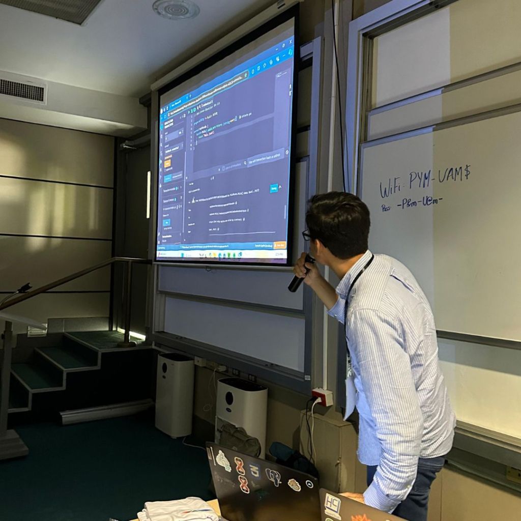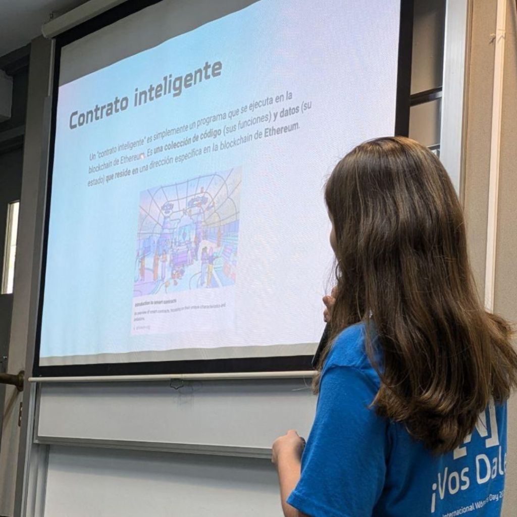 » El enfoque de este taller fue explicar cómo funciones blockchain y que significa crear y desplegar un programa en blockchain. Se practico con el lenguaje de programacion Solidity en el entorno de desarrollo accesible en un navegador llamado Remix» nos comparte Elena.