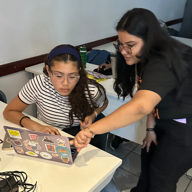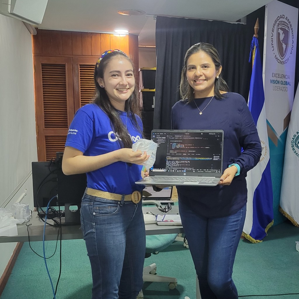Oneyda Valle junto a Ana Mayela Campos, instructora del Campamento Tech, luego de finalizar un ejercicio muestra el código creado con Python.